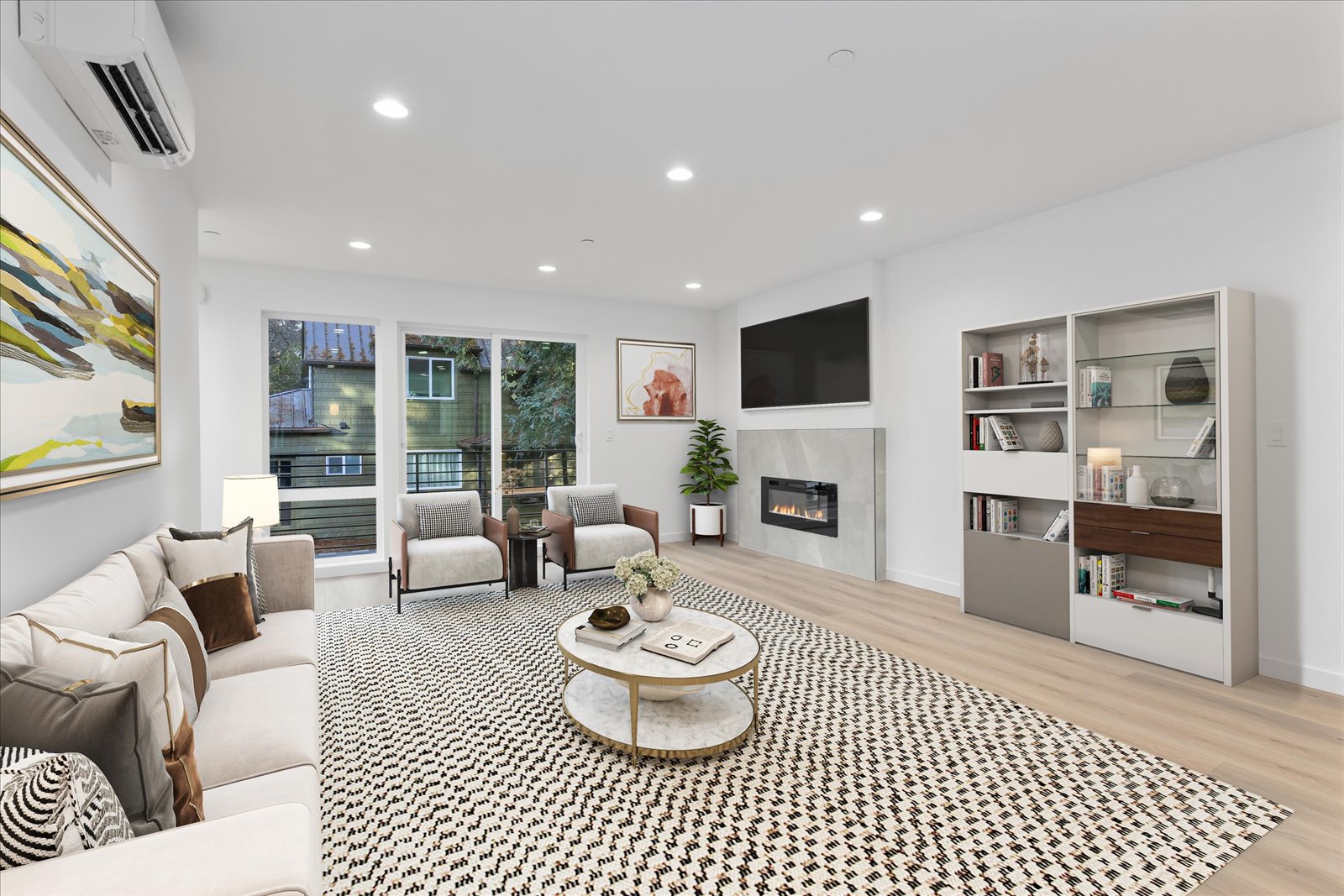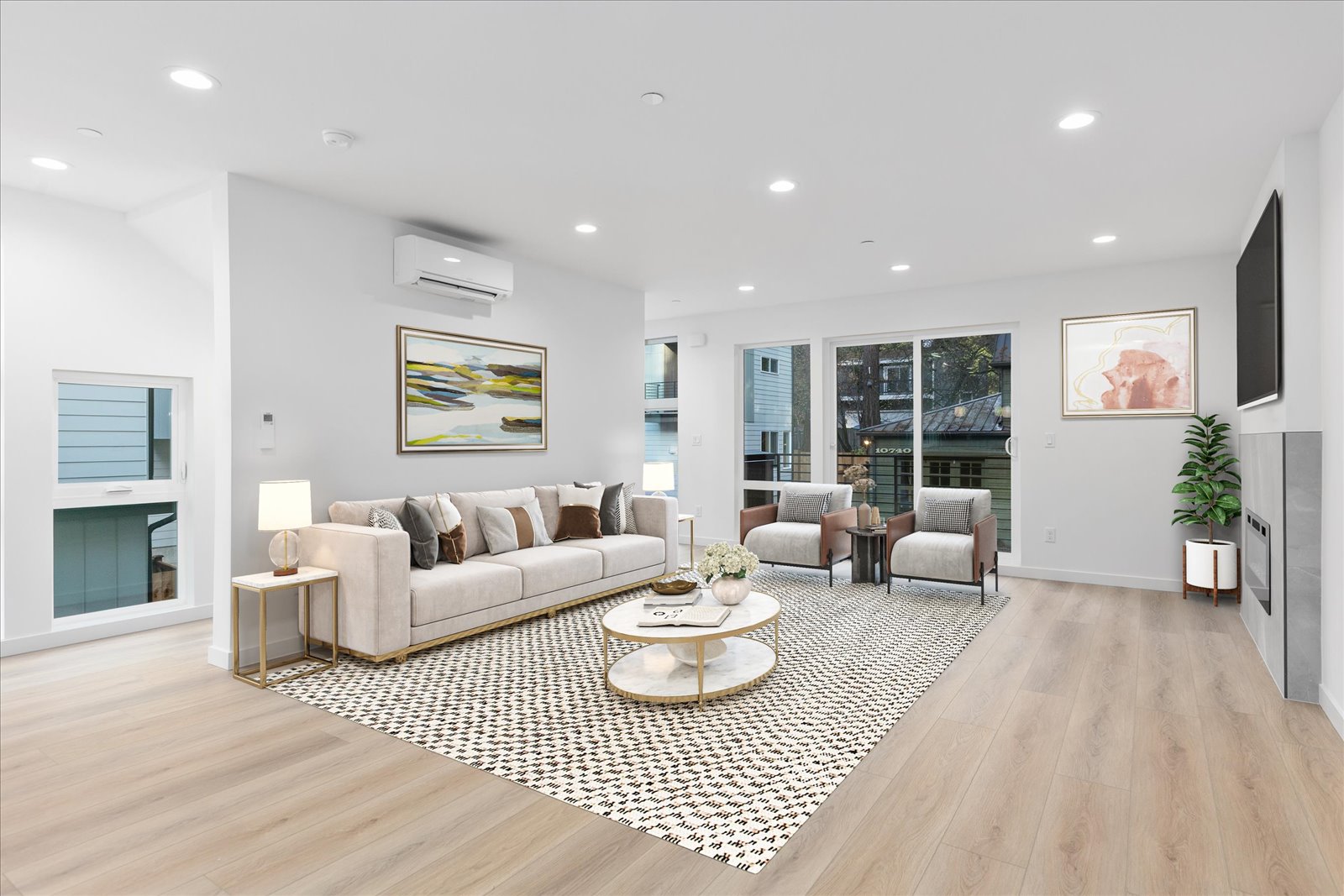 Experience the pinnacle of modern living in this expansive, three-bedroom new construction home. The main level impresses with a light-filled, open-concept design set around a luxurious fireplace, the perfect backdrop for entertaining. The chef’s kitchen features high-end stainless steel appliances and sleek surfaces. Flow seamlessly from the spacious living area to a private outdoor balcony. Upstairs, the primary suite is a true retreat, boasting soaring ceilings and a spa-inspired bathroom designed for relaxation. Enjoy a massive rooftop deck, offering an abundance of space for summer gatherings and views. Complete with a EV-ready garage, this home checks every box.